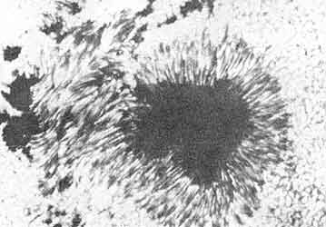 Figura 25. Acercamiento de una mancha. En las fotografías telescópicas de alta resolución se puede distinguir en detalle la estructura de una mancha solar. La oscura sombra del centro (o umbra) se encuentra rodeada por una región filamentosa con fibras claras y oscuras llamadas penumbra. Las manchas pequeñas suelen carecer de penumbra y en los grandes grupos de manchas es común que las penumbras individuales se confundan en una penumbra común.