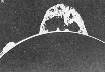 Figura 26. Las protuberancias. Como manifestaciones espectaculares de la gran actividad de la superficie solar se encuentran las protuberancias que son enormes oleadas de material que surge hacia la corona y que se mantienen erguidas a veces hasta por varios meses. La protuberancia de la fotografía tiene una altura de 370 000 km (casi 30 veces el diámetro de la Tierra) y por ella el material se eleva con una velocidad de casi 600 000 kilómetros por hora.