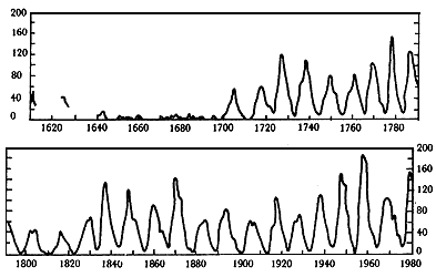 Figura 27. Los ciclos de las manchas solares. En la figura se muestran los promedios anuales del número de manchas que se han ido registrando desde 1610. Como puede observarse, este número tiene máximos y mínimos que se repiten en forma bastante periódica. El periodo promedio es de 11.2 años, pero suelen haber periodos cortos, de 8 años, o largos de 16. Puede también observarse que no todos los máximos son igualmente intensos, ni tampoco todos los mínimos.