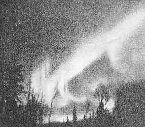 Figura 28. Despliegue de la luz auroral. La actividad solar tiene muchos efectos directos sobre la Tierra como la perturbaciones magnéticas, la interferencia en las comunicaciones por radio y también los bellos despliegues de luz en el cielo de las regiones cercanas a los polos llamados auroras.