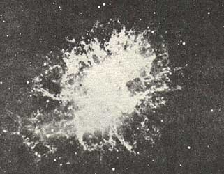 Figura 29. Los residuos de una supernova. La famosa nebulosa del Cangrejo está formada por los residuos en expansión de una enorme estrella que al final de sus días estalló como una esplendorosa supernova, hace casi mil años. El núcleo de la estrella quedó convertido en un pulsar que emite intensos pulsos de radiación 30 veces por segundo.