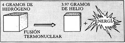 Esta transformación de materia en energía es consecuencia de la equivalencia materia-energía, enunciada por Albert Einstein en su famosa fórmula E=mc2; donde E es la energía resultante, m es la masa transformada en energía, y c es la velocidad de la luz (300 000 kilómetros por segundo). La cantidad de energía que se libera en los procesos de fusión termonuclear es fabulosa. Un gramo de materia transformado íntegramente en energía bastaría para satisfacer los requerimientos energéticos de una familia mediana durante miles de años.