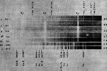 Figura 5. El espectro de la luz de una estrella puede grabarse en una placa fotográfica o bien cuantificarse en forma gráfica utilizando un detector electrónico. Hay diferencias obvias en el espectro de los distintos tipos de estrellas.