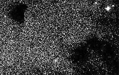 Fig. 6. Entre las estrellas existen grandes nubes de gas y polvo cósmico. Estas nubes proporcionan la materia prima de la que se condensan las nuevas estrellas. En esta fotografía, las nubes son visibles porque el polvo cósmico que contienen es opaco a la luz de las estrellas que se hallan detrás de ellas.