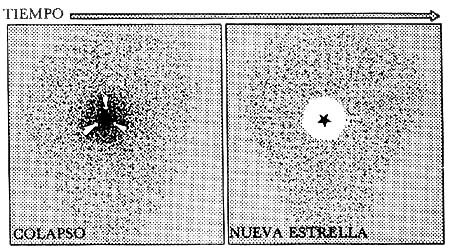 Este polvo bloquea la luz de las estrellas que se hallan detrás de la nube y debido a este efecto es que se puede detectar a las nubes (véase la Fig. 6). Pues bien, del gas libre que constituye a estas nubes se forman las nuevas estrellas. Esto ocurre de la siguiente manera: debido a alguna perturbación una parte de la nube comienza a contraerse ayudada por la atracción mutua de las partículas que la forman. Este proceso de contracción, llamado colapso gravitacional, hace que la densidad de la porción de la nube en colapso aumente más y más hasta que se constituye en un núcleo de alta densidad del cual se formará una nueva estrella (véase la Fig. 7).