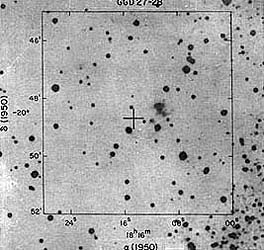 Figura 8. La cruz marca la posición de un nueva estrella formada en el seno de esta nube. La estrella no puede observarse en la fotografía, igual que un ser humano en gestación.