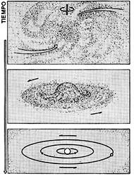 Habíamos dicho que un modelo que describa la formación de un sistema solar como el nuestro debería ser capaz de explicar por qué las órbitas de los planetas están en un mismo plano y por qué los planetas terrestres son tan distintos de los jovianos. Los fragmentos de nube que se colapsan para formar una estrella deben, en general, tener movimientos internos caóticos. Sin embargo, es muy probable que, como un todo, el fragmento tenga una cierta cantidad de energía en rotación. Esta rotación presente hace que el colapso se modifique profundamente. En lugar de que se forme una esfera cada vez más pequeña, lo que se forma es una nube aplanada con un núcleo central (véase la Fig. 9). De este núcleo se formará la estrella, mientras que la parte aplanada evolucionará hasta condensarse en forma de planetas. Como éstos se forman del disco gaseoso alrededor del núcleo, se explica que tengan sus órbitas en un mismo plano. Los astrónomos creemos que la formación de un disco alrededor del núcleo central es un fenómeno común, puesto que lo observamos no sólo en el Sistema Solar como un todo, sino también en Saturno y Júpiter, planetas que tienen sistemas de anillos y satélites con sus órbitas contenidas en un plano.