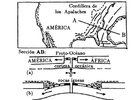 La teoría fijista afirma que la distribución geográfica de los grandes bloques continentales y la evolución geológica de éstos han estado gobernadas por esfuerzos verticales de la corteza terrestre, y que los movimientos horizontales de las grandes cadenas montañosas son consecuencia de los primeros. A mediados del siglo pasado, los geólogos W. B. Rogers y H. D. Rogers determinaron que los sistemas montañosos de los Montes Apalaches, en la porción oriental de Estados Unidos, estaban formados por secuencias de sedimentos de varios kilómetros de espesor que se depositaron originalmente en un ambiente marino de aguas someras. James-Hall sugirió en 1859 que esa porción oriental de Estados Unidos se había hundido paulatinamente hasta conformar una fosa y que, posteriormente, por esfuerzos compresionales, los sedimentos contenidos en ella se plegaron y se rompieron, dando lugar a la formación de la Cordillera de los Apalaches (Figura 1).