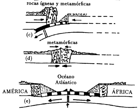 Figura 1. La evolución geológica del Océano Atlántico es el resultado de la separación de los continentes africano y americano, en forma intermitente. Durante el Precámbrico, hace más de 570 millones de años (m. a.), el continente africano se separó del americano (a). La separación continuó y dio origen al protoatlántico (b). Entre el Carbonífero y el Pérmico (350-286 m. a.), la corteza oceánica fue asimilada por el bloque continental de América y se acercaron los dos continentes (c). En el Permo-Triásico (250-225 m. a.), los dos continentes se impactaron y se formó la cordillera de los Apalaches (d). Del Jurásico al Reciente (180 m. a. a la actualidad), los dos continentes se separan para dar lugar al actual Océano Atlántico (e).
