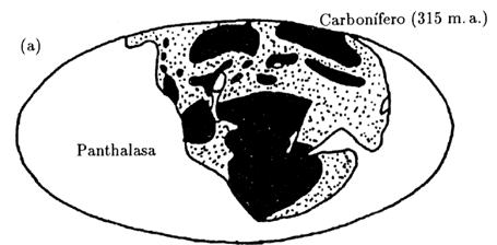 Figura 2. El científico alemán Alfred Wegener, en su obra de 1915 El origen de los continentes y de los océanos, concibió la idea de un solo continente circundado por el Mar de Tethys. Las zonas con puntos son corteza continental, inundada por mares someros; las zonas negras son el continente expuesto. Panthalasa era el antiguo Océano Pacífico (m. a. = millones de años).