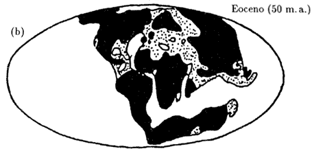 Figura 3. a) Francis Bacon en 1620 y, dos siglos y medio más tarde, F. Snider P. ya habían concebido la idea del ensamble de los continentes con base en la configuración de sus bordes y en el contenido de plantas fósiles en las rocas. b) En modelos como éste son contemporáneos y no difieren grandemente de aquellos propuestos en siglos pasados. Su diferencia estriba en que ahora toman en consideración factores tales como cadenas montañosas, secuencias estratigráficas, contenido fósil, edades radiométricas y anomalías magnéticas, entre otros.