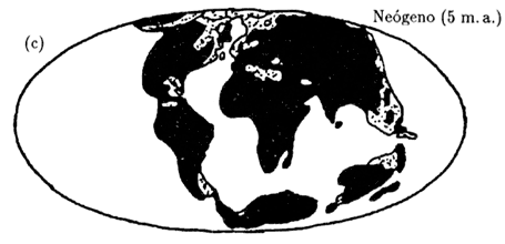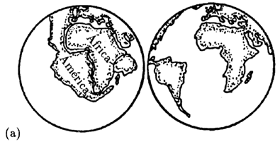 El conocimiento formal sobre el desplazamiento de las masas continentales con apoyo de datos científicos surgió a principios de este siglo con H. B. Barker, F. B. Taylor y Alfred Wegener. Los dos primeros científicos ensamblaron las masas continentales tomando en cuenta la continuidad de las cadenas montañosas de los continentes: americano, europeo, africano y australiano (Figura 4). Por otro lado, Alfred Wegener, entre 1912 y 1915, colectó muestras de restos fósiles, midió estructuras geológicas e hizo estudios petrográficos y estratigráficos en ambos lados del Océano Atlántico. En ellos comprobó la afinidad y correspondencia de las secuencias rocosas depositadas hace 400 000 000 de años en un supercontinente único de edad paleozoica, al que denominó Pangea (Figuras 5 a 7).