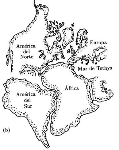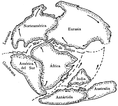 Figura 6. El megacontinente Pangea en proceso de deriva durante el Jurásico, hace 180 m. a. El hemisferio norte es Laurasia y el sur Gondwana. Ambos hemisferios fueron separados por el Mar de Tethys.