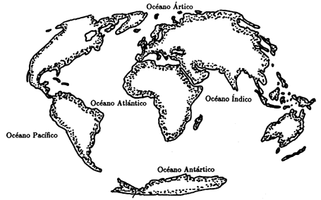 Figura 7. Distribución actual de los continentes y océanos después de 180 m. a. del rompimiento de la Pangea y del desplazamiento de los bloques continentales.
