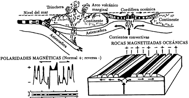Con las evidencias geológicas y geofísicas que indican el gran dinamismo que está ocurriendo en la Tierra, se inició la década de los sesenta. Este periodo es de gran trascendencia científica, puesto que casi simultáneamente dos científicos estadunidenses construían una nueva idea acerca del origen de la movilidad de las masas continentales, Harry H. Hess, de la Universidad de Princeton, y Robert S. Dietz, de la U. S. Coast and Geodetic Survey. En forma independiente ambos interpretaron que los fondos oceánicos se están renovando continuamente a través de grandes fracturas conocidas como cordilleras oceánicas, por donde se expulsa el magma que proviene de la astenosfera y que se enfría al contacto con el agua oceánica. El fondo del océano se desplaza, a la vez, lateralmente, llevando consigo los sedimentos y las masas continentales en forma de grandes placas, en cuya unión aparecen las dorsales o cordones de expulsión magmática (Figura 8).