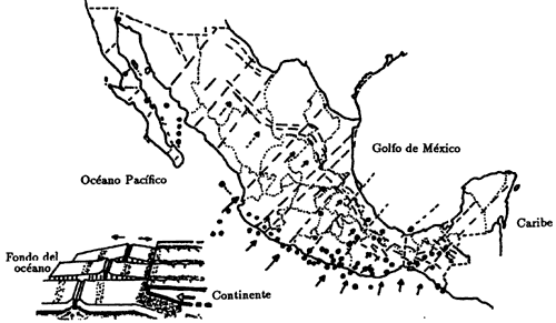 Figura 22. Las flechas indican la dirección del movimiento de la placa oceánica abajo del continente, del suroeste hacia el noreste, y en el esquema inferior se ilustra el deslizamiento del fondo oceánico bajo el continente. Las líneas discontinuas en el interior del continente indican algunos sistemas de fracturamientos regionales; las flechas, la dirección de los esfuerzos tectónicos que dieron origen a la formación de la Sierra Madre Occidental y a la de Chiapas.